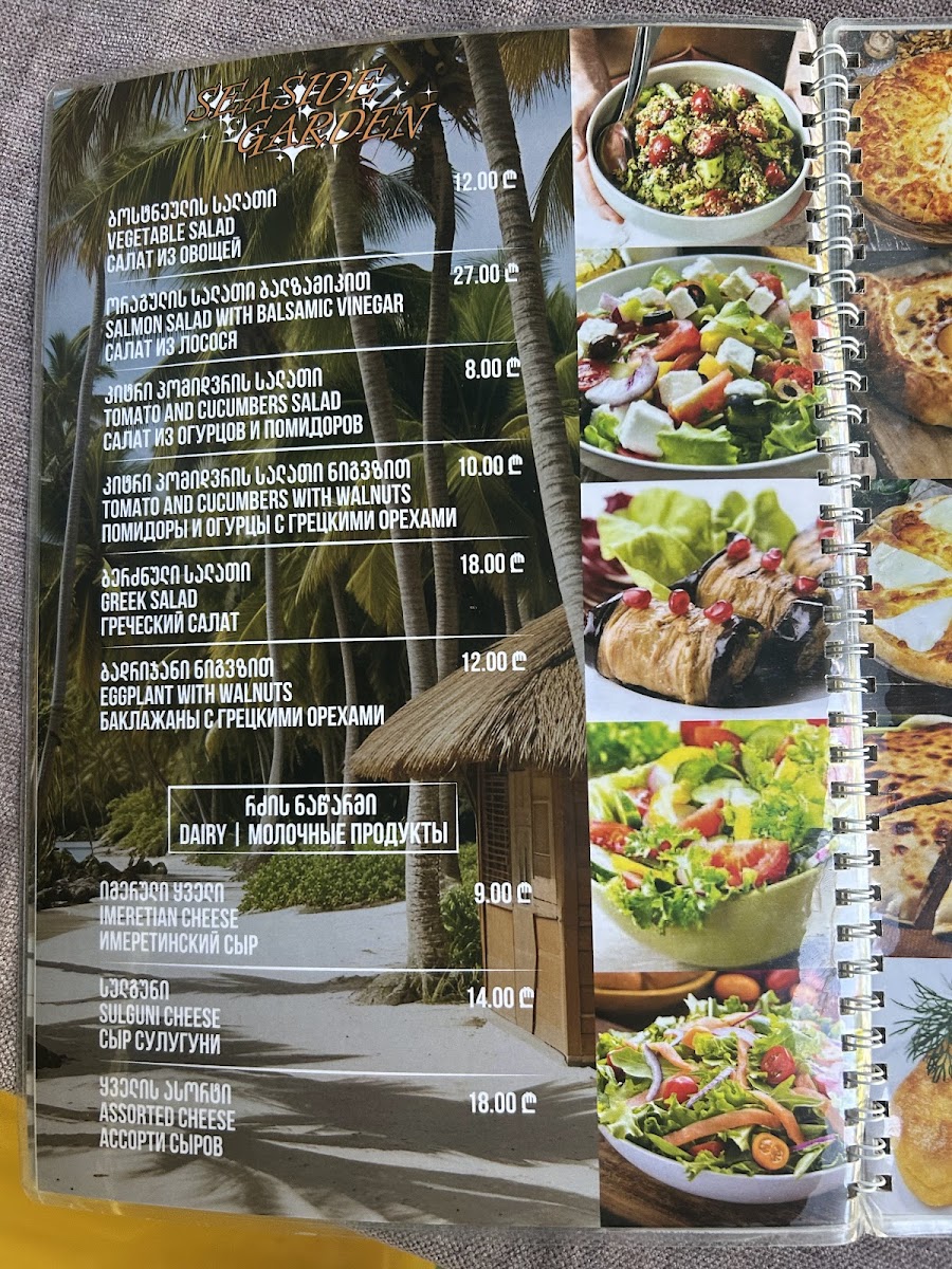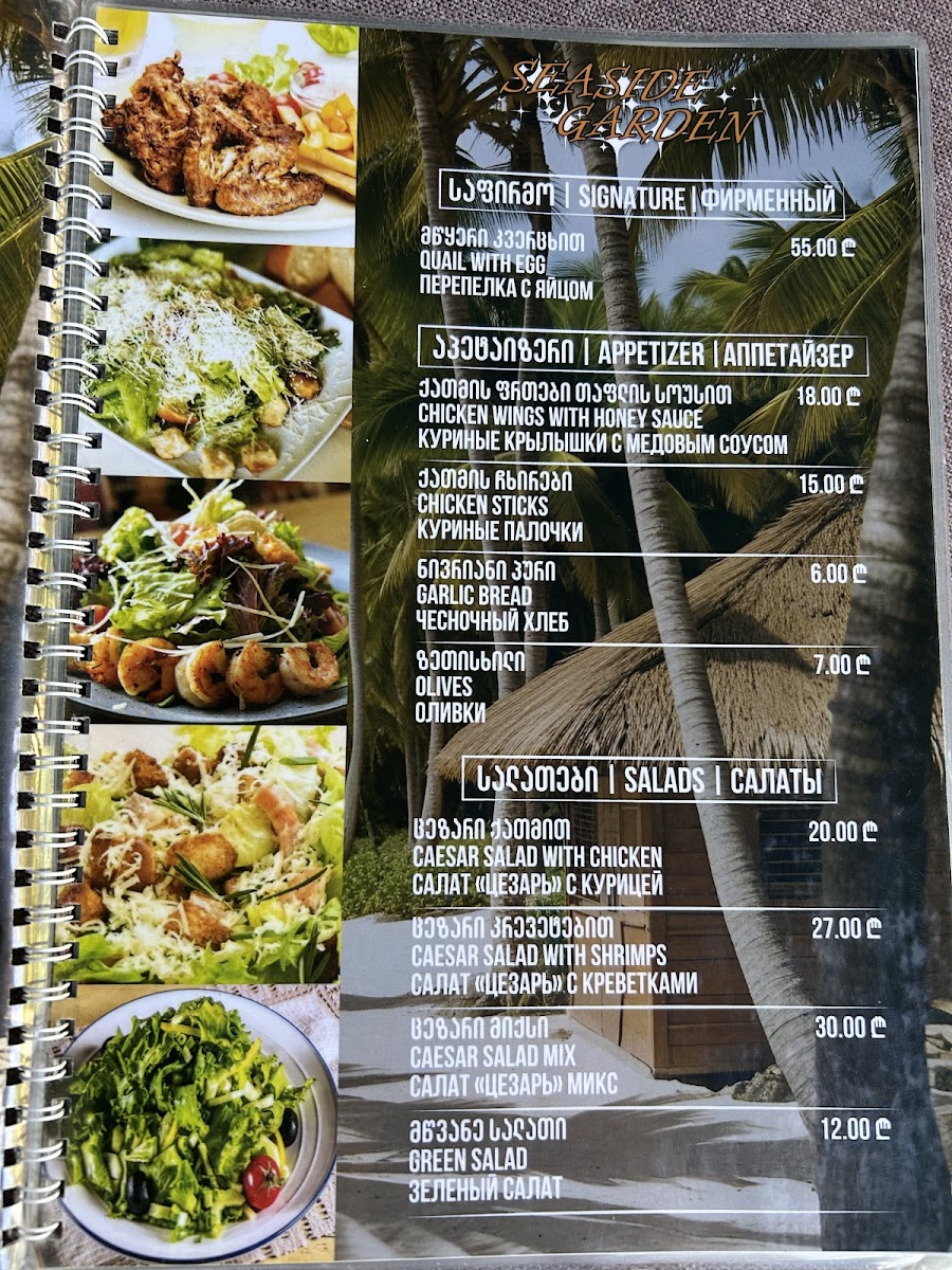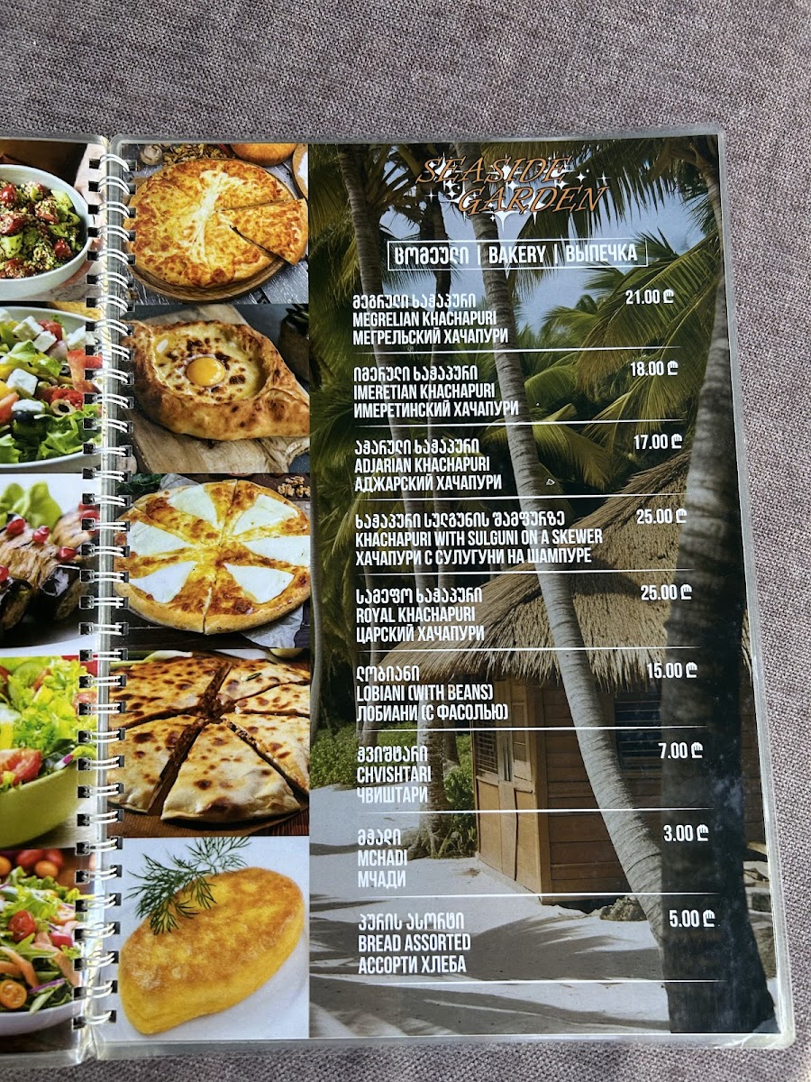 Introducing Seaside Garden, a charming café nestled at the Railway Station in Batumi, Georgia. This delightful eatery invites you to savor an authentic Georgian dining experience, marked by its warm atmosphere and friendly, albeit language-limited, staff. The menu, thoughtfully designed in both English and Georgian, features enticing photographs that simplify the ordering process.